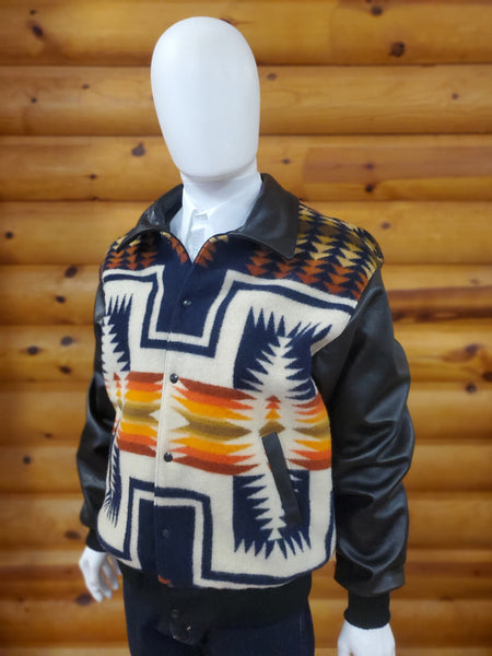 Warmth and durability are built right into this distinctive Southwestern style jacket. Made with jacquard fabric by Pendleton® that is rich in jewel tone colors and brings drama to this classic jacket silhouette. Black Napa leather sleeves and collar. Knit cuffs and waistband. Outside welt pockets, inside pocket. Heavy duty, metal snaps up the front keeps you toasty warm. Pure virgin wool/ cotton blend with sateen lining. Designed and constructed by Kraffs. The perfect jacket to keep you snug against the wind and cold.