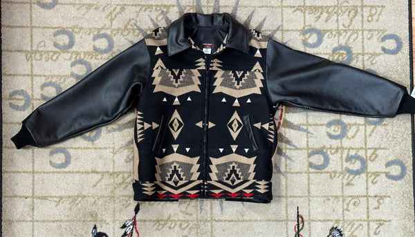 A Kraff’s original design, our leather bomber jacket is made with jacquard fabric by Pendleton®. Earth tone colors, with a pop of red, bring drama to this classic jacket silhouette. Soft Napa leather sleeves and collar. Knit cuffs and waistband. Outside welt pockets, inside pocket. Heavy duty, molded- tooth zipper keeps you toasty warm. Pure virgin wool/ cotton blend with sateen lining. Designed and constructed by Kraff's.