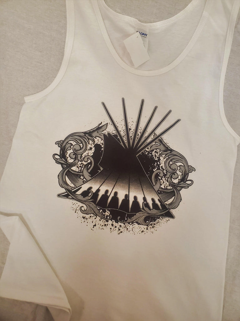 100% preshrunk cotton tank with beautiful tepee design laid over a lively swirl pattern.