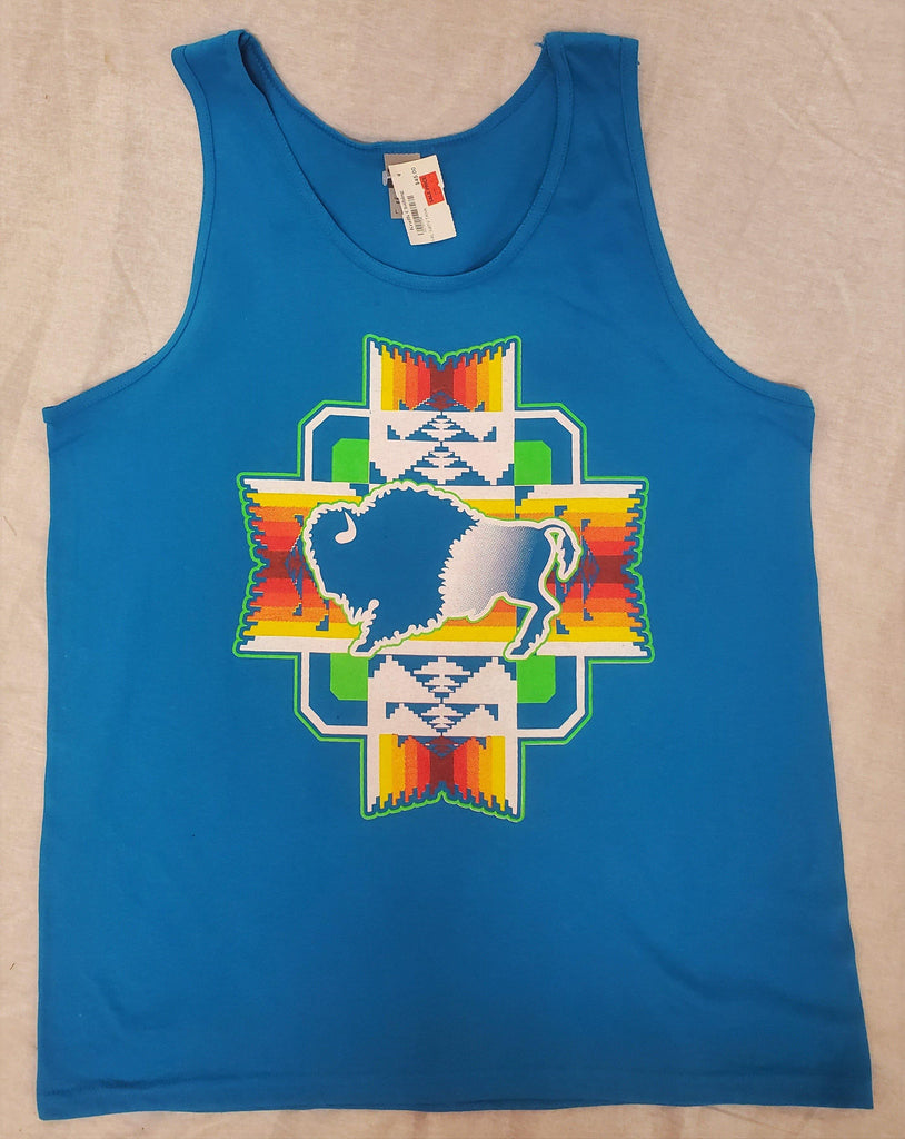 Geometric elemental backdrop with buffalo silhouette presents a unique design in the comfort of a tee-shirt. The gradual fire color stripes looks great with any color available.
