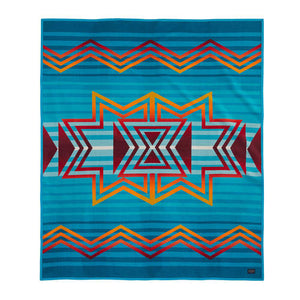 This blanket's design pays tribute to the Indigenous person representing more than one tribe. An hourglass shape evokes the matriarchal society of the Navajo, a serape layout honors the Yaqui, and turquoise symbolizes the Pueblo of Laguna—the Many Nations of the artist, Dustin Lopez. Woven from pure virgin wool in our Pendleton, Oregon, mill.